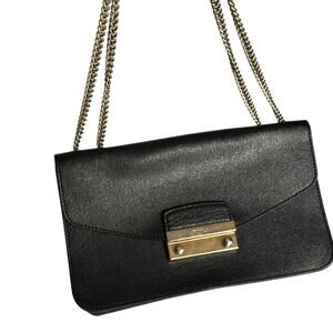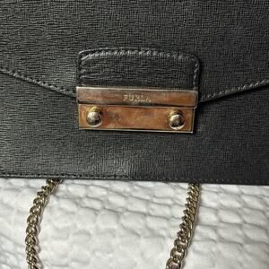 Furla black leather shoulder bag with a sleek chain two-way strap. Minor wear. Good condition. See pictures for details. Pre-loved. Comes with dust bag.