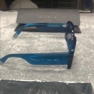 Stylish Furla sunglasses with a bold blue frame. Rectangular shape for a modern look. Perfect for any occasion.