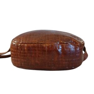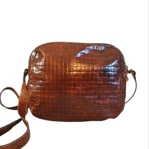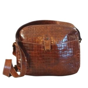 This Furla crossbody bag features a rich brown color and is crafted from high-quality leather with a sophisticated woven texture. Its rounded boxy shape and long adjustable strap make it both stylish and practical for everyday use.
