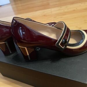 Elegant burgundy heels with black trim. Perfect for any occasion.