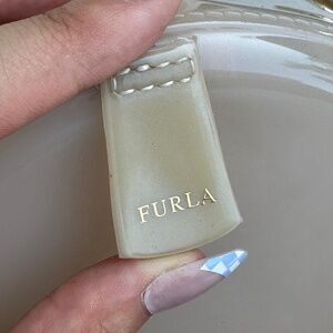 This Furla Candy Boston Bag features a structured silhouette crafted from high-gloss PVC in a neutral stone (taupe) tone. The jelly-like material offers both durability and a modern, playful finish, contrasted with gold-tone hardware and double top handles. The bag closes with a full-length zip closure and is detailed with tonal stitching and subtle embossed Furla branding on the front.