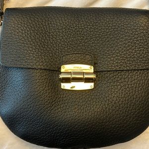 Furla's Club Crossbody bag is a super functional bag to add to your collection. It has been designed from a pebbled black leather body in a stunning feminine structure. It features a flap style secured with a gold-tone lock closure and comes fitted with an adjustable shoulder strap for a cross-body styling. This bag can easily house your essentials for those clubbing nights so that you are hands-free to dance the night out!