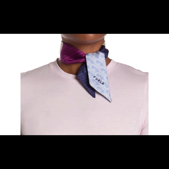 Furla Designer Silk Scarf. NWT. Very stylish multi colored small silk scarf. Blue colors, purple-pink colors and light tanish colors. Logo print, dry clean. Would be a great gift! Open to offers!