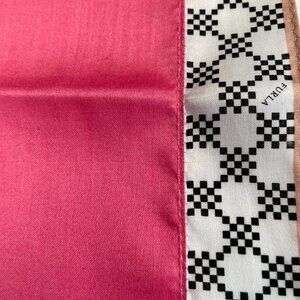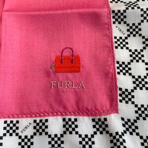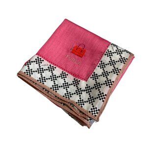 Chic Furla scarf featuring a pink center with a small embroidered red handbag graphic and the "FURLA" logo. The border showcases a bold black and white geometric pattern, trimmed with a light brown accent for added contrast. Made of cotton, this square scarf reflects Furla’s signature Italian elegance. Furla, established in 1927, is renowned for its high-quality handbags and accessories.