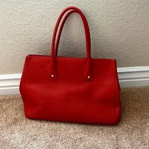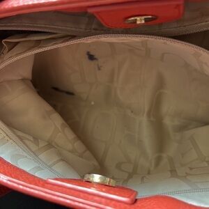 Magnetic closure for main pocket. 2 zippered inside pockets and 2 other inside pockets. A little bit of scuffing on the bottom corners and some staining inside, but otherwise In great condition. The color is burnt Orange