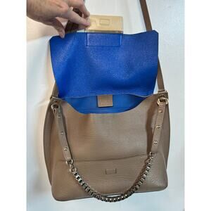 Taupe exterior with cream and black accents and fun modern hardware. Interior is electric blue. You can wear either the crossbody strap or use the chain strap for a shoulder bag.