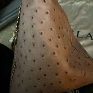 Elevate your style with this Furla pink ostrich-embossed bag. Perfect for any occasion, it combines elegance and functionality.