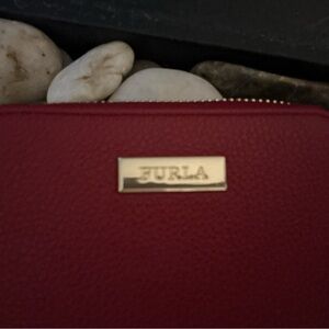 Chic Furla wallet in rich burgundy leather. Features a secure zip closure.
