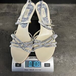 Furla Size 39 US 8.5 Snakeskin Embossed Leather Strappy Ankle Heel Sandals Blue Cream Glam Party Formal Animal Print Cocktail Indie