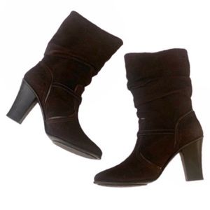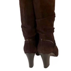 Furla Suede and Leather Trim Boots. Brown genuine suede with brown genuine leather trim, wrap around buckle detail, and 3.5” heel. Effortless pull on wear. Size 41. Very good condition inside and out. Smoke free home. Fast shipping.