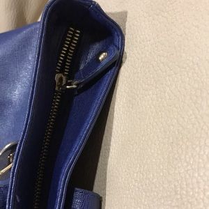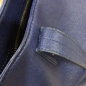 All leather tote with fob, one inside zipped pocket and also zipped top, small tear on one strap as shown, very clean inside, no smells