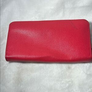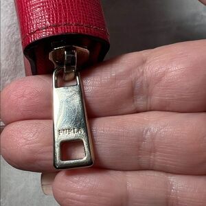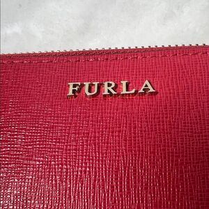 Furla wallet in a striking red hue. Sleek design with gold logo detail. Perfect for everyday elegance.