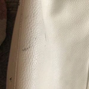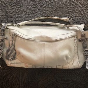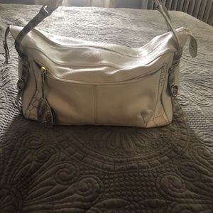 This Furla shoulder strap bag is roomy and stylish both. The white leather exterior featuring gray and white snakeskin straps and silver buckles makes this purse a stand out. The outside is in near perfect condition, the inside displays Furla lining with 2 pockets and one zippered side. There is plenty of room in this bag for essential items and more. Easy to wear with jeans or dress up for a night out.