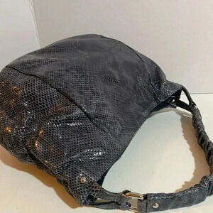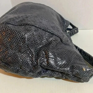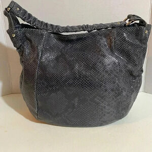 Furla gray black snake skin leather hobo handbag with silver tone hardware 3 compartment 1 zip pocket closure at interior wall jacquard fabric lining snap closure at front minor fading hight 13” width 15” depth 7” strap drop 9” The dimensions are based on approximately measurements before placing an order please check take a moment to view all photos using feature for a closer look