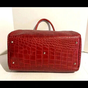 Authentic Furla red embossed leather satchel handbag with silver tone hardware main compartment 1 zip pocket closure at interior wall raw suede & jacquard lining zip closure at top 5 protective metal foot base double handles Bag dimensions are based on approximate measurements. Before placing an order please take a moment to view all photos using zoom feature for a closer look