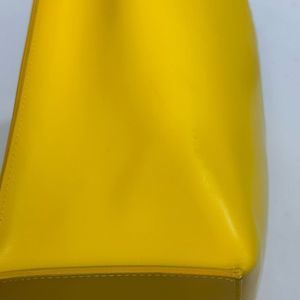 Furla Divide It yellow leather mini tote bag is in the color “limoncello”, and has an inner PVC diagonal divider, the logo embossed on the bottom front, a logo bag charm, and double handles. There are some barely visible spots on the leather (refer to pics), but this bag is in otherwise excellent condition. This is a pre-owned item with basic wear and fade. Please refer to the pictures and size measurements.