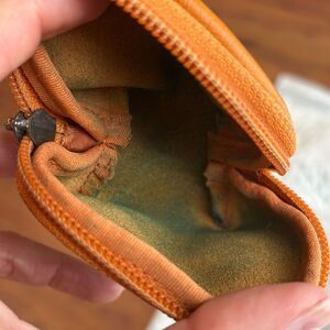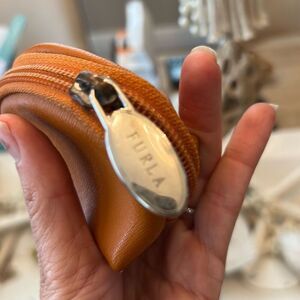 Furla orange leather coin purse small Exterior in very good condition Interior has green staining on the suede Size is 3 x 2 x 3