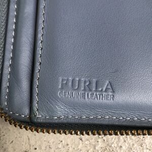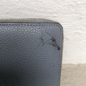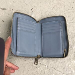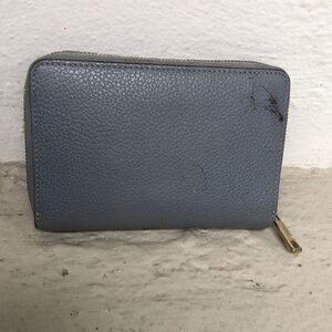 Color is a gray blue. Wallet is in good condition except for the Mark that I show that needs clean up. Measures 5.5 by almost 4 closed