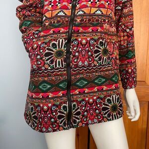 There are no tags but it’s a solid medium. Front pockets and a fur lined hood make this vibrant zip jacket even better! It’s fleece lined.