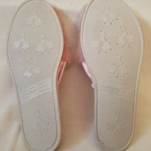 Pink Furry and Satin Bedroom Slippers with white soles. NWOB, never worn, Comfy slides with cushion insoles. Satin accents both sides for that elegant look. Size 6 1/2 to 7 1/2 medium. Does say washable on the soles and has a beautiful leaf design. SFPF home.
