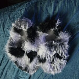 Cozy slippers with a furry black and gray design. Perfect for lounging.