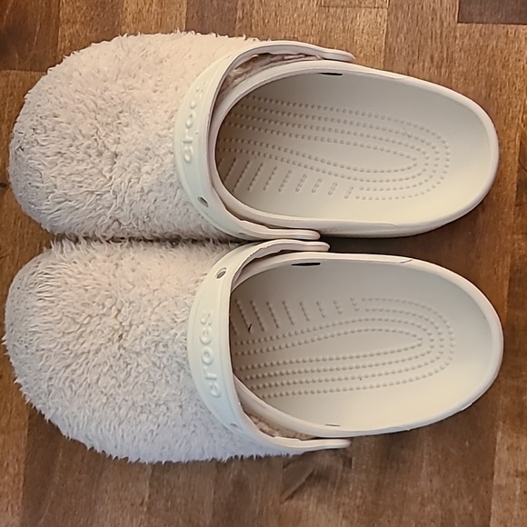 Cream colored Crocs, gently worn. Some discoloration noted in pics.
