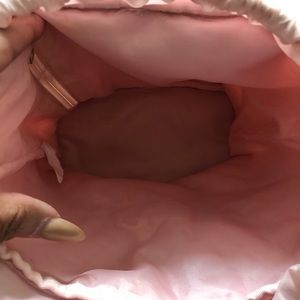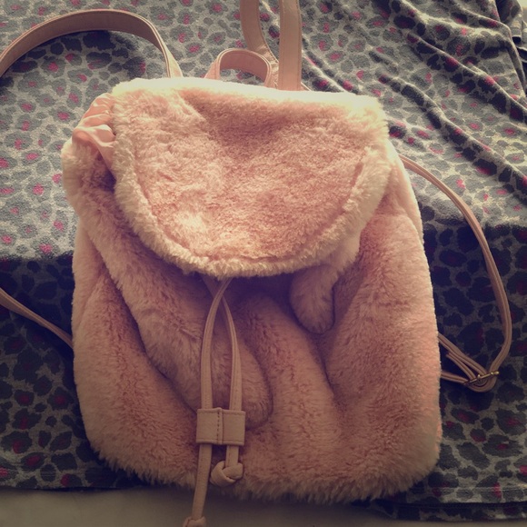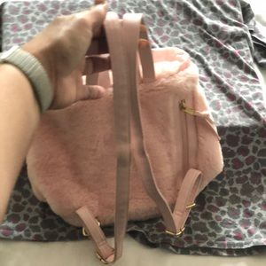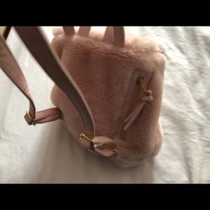 Gently used furry back-pack. Color: Soft Pink. Width 10. Height 14. Gold hardware. Straps in great condition. Side zipper for easy access inside bag.
