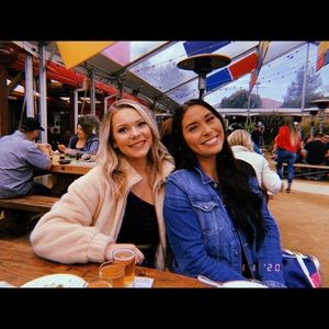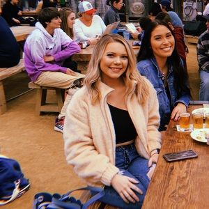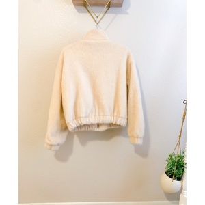 Cute fluffy jacket, super pale pink/cream color. Elastic at the bottom for a puffer effect. Satin quilted lining inside. This jacket is SO comfy. Only worn once or twice - included photos of it on!