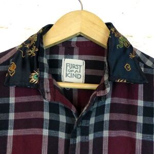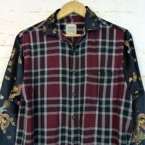Pre-owned condition, Furst of A Kind Shirt L/XL Reconstructed Plaid Flannel Dragon Satin Sleeves Mixed Media Button. Unique Furst of a Kind button-up shirt. Mixed media, reworked aesthetic. Unisex oversized fit.