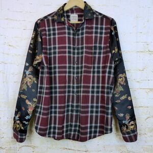 Furst of A Kind Shirt L/XL Plaid Flannel Dragon Satin Sleeves Mixed Media Button