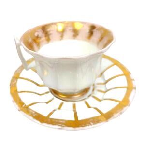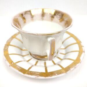 German tea cup saucer set is in well used, but in good condition. No cracks or chips. Unique rare pattern stylized Greek macaroons in the form of Athena.