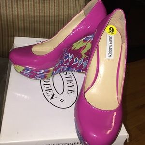 Fusch Pat wedges with a baby blue , green and dark blue bottom
