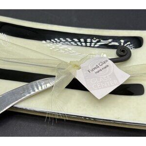 Experience the unique elegance of this handmade fused glass serving tray, accompanied by a matching knife, both crafted with care by the artist Addie Ryan. The tray measures 9" x 5" and features a sophisticated ivory black color palette that seamlessly blends with a variety of decor styles. The rectangle shape makes it a versatile choice for carrying appetizers, desserts, or drinks to your guests.Each piece is a testament to the skillful production technique of fused glass, showcasing a durable and aesthetically pleasing finish. The set includes two items, perfect for coordinating your serving needs or gifting to someone who appreciates artisanal craftsmanship. Whether used for special occasions or as a statement piece in your home, this set is sure to impress.