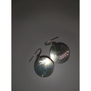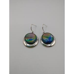 Fused glass round dangle iridescent earrings silver tone pretty shimmer