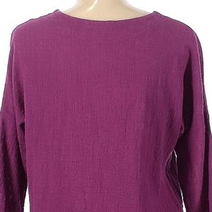 Brand new gauzy blouse in a size large (fits more like a medium). Purple fushia color, elbow 3/4 sleeve, square front pockets, round neck. No material tag. New condition with no noted flaws.