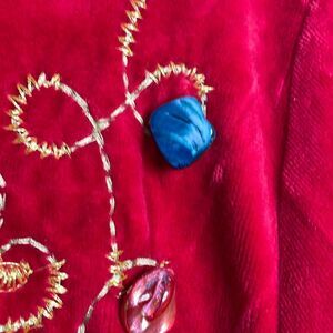This is so unique. It is a red velvet dress with a collar and zippered neckline. It is embroidered but has gemstone accents as well as metal grommets. Really neat! Total length 58” and pit to pit about 20”