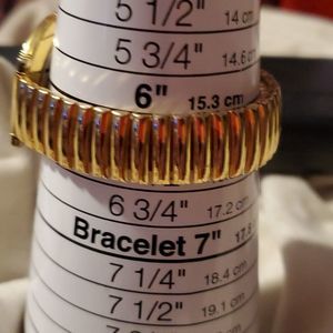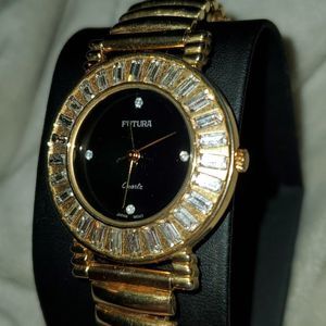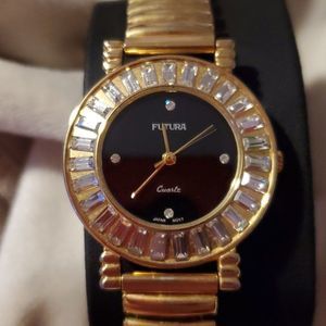 Gold band & case, with emerald cut crystals surrounding the face in a Sunburst pattern. The face is black with 4 diamond markers.