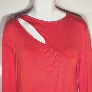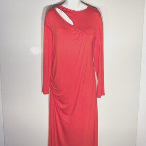 Bold red, (on the red orange side),soft knit midi dress with asymmetrical cut out detail