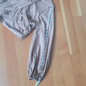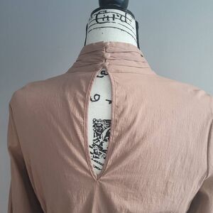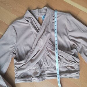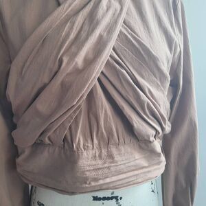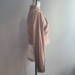 Future Collective Reese Blutstein medium tan beige structured long sleeved top cropped fit bishop sleeves mock neck with a keyhole button closure in the back. In excellent pre owned condition with no damage and minimal wear as shown in photos.
