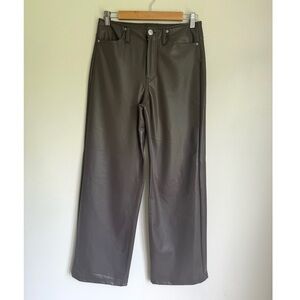 These pants are high-waisted, wide-leg trousers made from a faux leather, giving them a sleek, slightly glossy finish. They are a muted dark gray charcoal color.