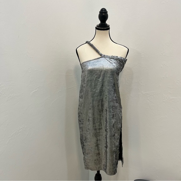 Shine in this elegant silver one-shoulder dress, perfect for any special occasion. The sleek design offers a sophisticated look.