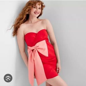 This stunning strapless dress features a bold red hue, perfect for making a statement. The large bow accent adds a touch of elegance and charm. Ideal for special occasions.