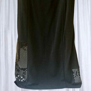 Black sequins - across square neckline, upper right side, lower right front, lower right that partially wraps around side and back hem area.