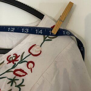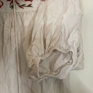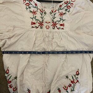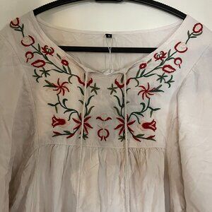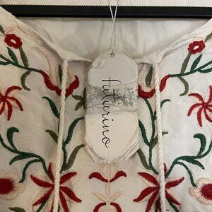 Futurino boho tunic top, new with tags. Size M. Taupe base embroidered with red, green, pink florals across top and hem. Billowy sleeves with elastic cuffs; relaxed, flowy body. Perfect with leggings or high‑waisted jeans.
