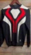 Futuristic, bold black, red & white sweater, w/fluid color-blocking, vertical stripes, & contemporary vibe.