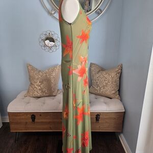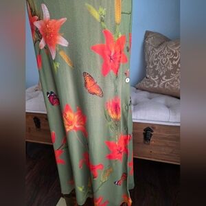 This Fuzzi dress features a vibrant floral and butterfly print on a green background, offering a fresh and lively summer look. The sleeveless design enhances its modern appeal, while the vibrant color ensures you stand out.