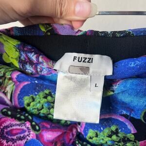 Fuzzi 'Gonna' skirt features a vibrant fruit print in shades of purple, blue, green, and magenta. Designed with a flattering ruched waist and a softly flared silhouette that hits below the knee. Size Large – waist approx. 15" laid flat; length approx. 28".