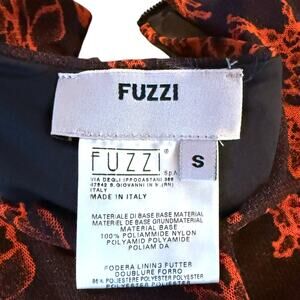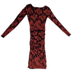 Stunning Fuzzi Italy ruched mesh dress, featuring a sheer black mesh base with striking red floral accents throughout. This dress features long sleeves, ruched detailing for a flattering fit, and a midi length. Crafted from signature lightweight stretch mesh with a comfortable lined interior. Perfect for cocktail parties, evening events, or date nights.