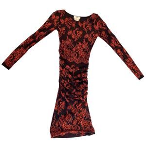 Fuzzi JPG Jean Paul Gaultier Mesh Floral Ruched Bodycon Dress S Black Red Long Sleeve Cocktail Whimsical Goth