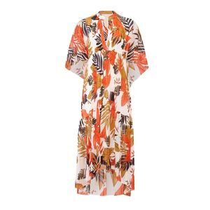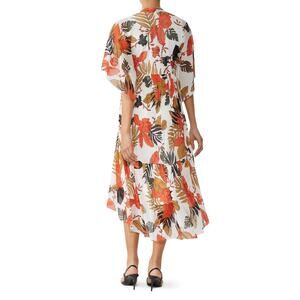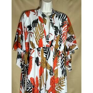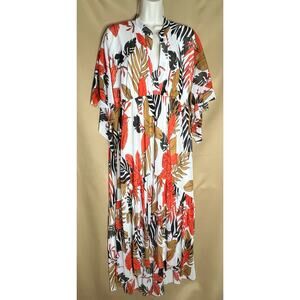 White printed tulle dress. 100% polyester. Short sleeves. V-neckline. Partially lined. 48” from shoulder to hemline.